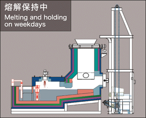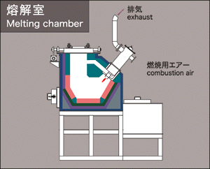 Since the combustion space of the holding chamber is large, radiant heat is large, and special high-alumina bricks are used especially for the floor of the melting chamber in consideration of strength and wear resistance.