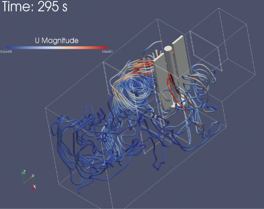 OpenFOAMソフトウェアを使用したシミュレーション画像(流線)GBF装置の回転流、上昇流による連続的アルミ溶湯循環の流れを検証。流体(アルミ)を非圧縮性流体として捉え、その密度・粘度・表面張力を反映させ、気体と液体の動きを一つの式で求める方法(VOF:Volume of Fluid)を使用。GBF装置で発生した溶湯の流れが、汲出し口全体に到達する。